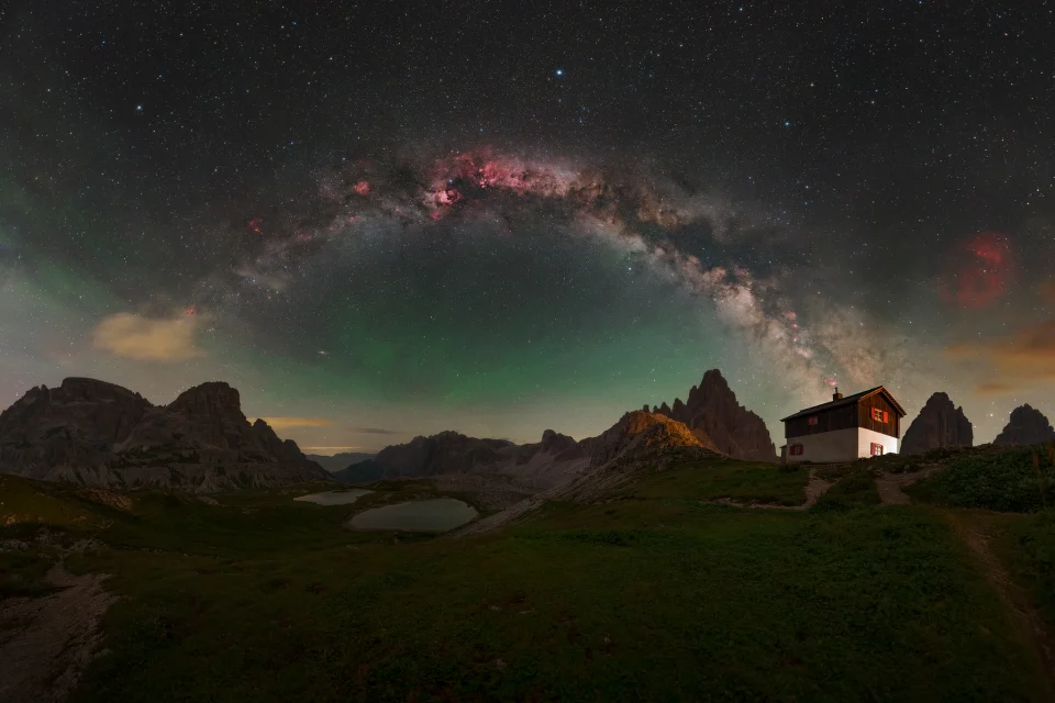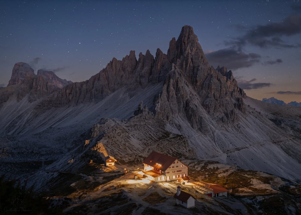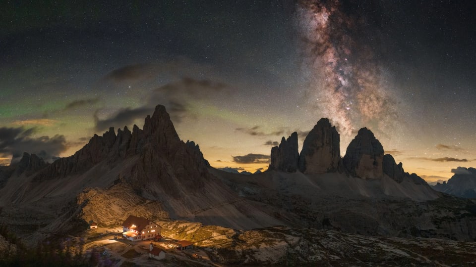 After arriving at the Tre Cime parking area, we’ll hike for approximately 1.5 hours on an easy trail to reach Rifugio Antonio Locatelli, where we’ll stay for two nights. Our booking here includes half-board. The area surrounding the hut offers endless compositions, with the Milky Way setting behind the peaks.